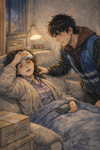 <소설가 미상 씨의 즐거운 쿠팡>13회. 새벽의 작은 거실, 돌봄의 시간. 사진=챗GPT 5.2 생성 이미지