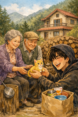 아기 고양이를 건네주려 기다리고 있는 사람은 깊은 산속의 양옥에서 노년을 보내는 노부부였다. 노란색 털로 덮인 아기 고양이는 태어난 지 사십 일 된 수컷이라고 한다.