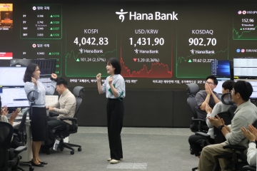 27일 코스피 지수는 사상 처음으로 4,000을 돌파했다. 이날 코스피는 전 거래일보다 101.24p(2.57%) 오른 4,042.83으로, 코스닥 지수는 전장보다 19.62포인트(2.22%) 오른 902.70으로 거래를 종료했다. 원/달러 환율 주간 거래 종가(오후 3시 30분 기준)는 전 거래일보다 5.4원 내린 1,431.7원을 기록했다. 이날 오후 서울 중구 하나은행 본점 딜링룸 현황판에 코스피, 원/달러 환율, 코스닥 지수가 표시돼 있다. 사진=연합뉴스